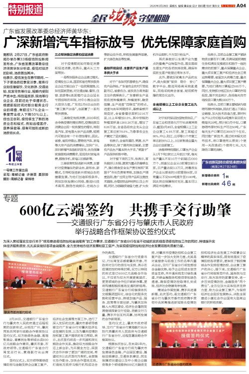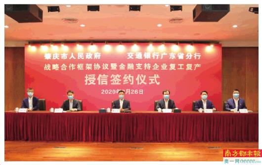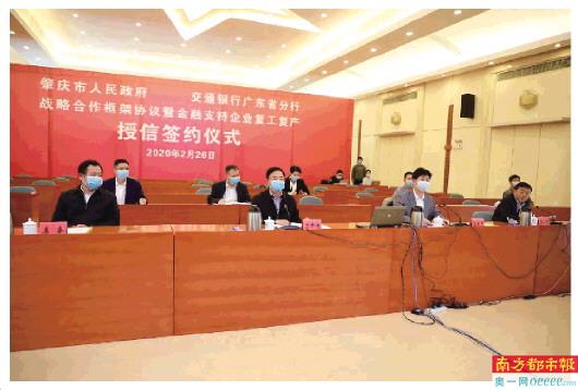 2月26日,交通银行广东省分行与肇庆市人民政府通过远程视频的创新形式,分别在广州、肇庆两地共同举行战略合作框架协议签约仪式。双方就绿色金融、高端制造业、普惠民生等领域达成600亿元战略合作意向。肇庆市委、市政府领导,交通银行广东省分行周宝志行长、黄海副行长出席仪式。