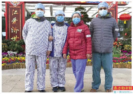 从左到右依次为中山大学孙逸仙纪念医院医生李伟超、王川、麦岚和蔡跃新。之所以穿病号服,王川解释说,一来可以多一层防护,二来非常易干。他还开玩笑说,穿上很拉风,走在街上就是最靓的仔。