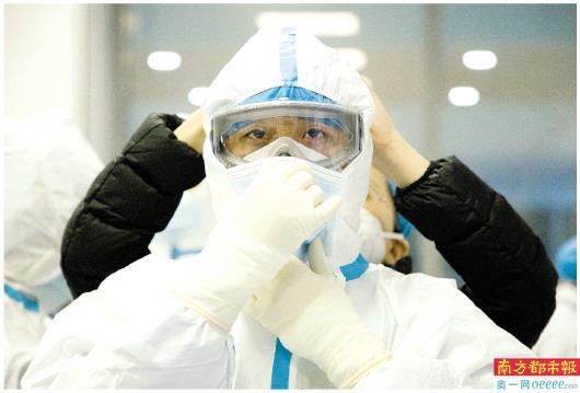 2月27日,武汉同济医院光谷院区E1二楼病区,准备换岗的广州中山三院医疗队员正在调整防护服外层的医用外科口罩。近日,该院打响了一场抢救新冠肺炎危重患者的“大决战”。 南都记者 张志韬 摄