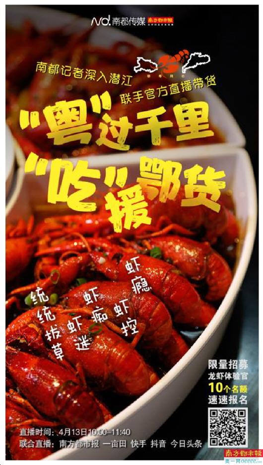 在广东省农业农村厅、湖北省农业农村厅、中共潜江市委、潜江市人民政府的指导下,南方都市报联合广东农产品“保供稳价安心”数字平台,将于4月13日上午10点举行“粤”过千里“吃”援鄂货——南方都市报直播带货潜江龙虾活动。南都将携手一亩田、快手、抖音、今日头条等主流直播平台,矩阵出击,以网络直播的形式,充分调动广东中荔农业集团有限公司、国联(益阳)食品有限公司、盒马鲜生、广东佰顺农产品供应链集团有限公司、深圳点筹互联网农业控股有限公司、广州市佬湘饮食有限公司、广州虾笼镇餐饮管理有限公司等一批广东采购商的强大购买力,同时兼顾零售端消费者。