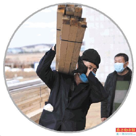 →4月10日,工人们在绥芬河方舱医院外搬运建材。