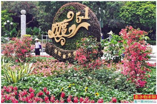 昨日,市政园林工人在广州人民公园门口摆放鲜花。“五一”假期临近,广州市林业园林部门在广州市中心人民广场设置主题花坛,用鲜花绿植装点节日街头。 新华社发