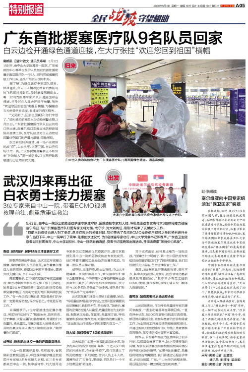 5月2日,由中山一院派出的危重症护理专家成守珍、医院感控专家刘大钺、呼吸危重症专家唐可京3位教授接力驰援塞尔维亚,与广东援塞医疗队归国专家无缝对接。成守珍、刘大钺两位,刚刚才结束了支援武汉工作。