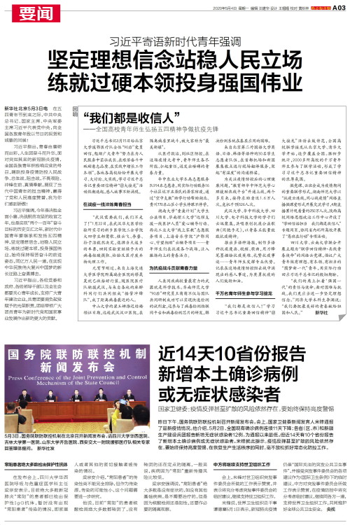 新华社北京5月3日电 在五四青年节到来之际,中共中央总书记、国家主席、中央军委主席习近平代表党中央,向全国各族青年致以节日的祝贺和诚挚的问候!习近平指出,青春由磨砺而出彩,人生因奋斗而升华。面对突如其