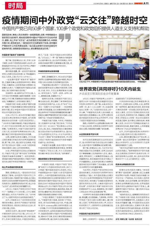 4月2日,中国共产党同世界上100多个国家230多个政党联合就加强国际抗疫合作发表《共同呼吁》。据了解,这是本世纪以来第一次,是十八大以来第一次,也是疫情发生以来第一次。“这是政党交往史上的一件大事。