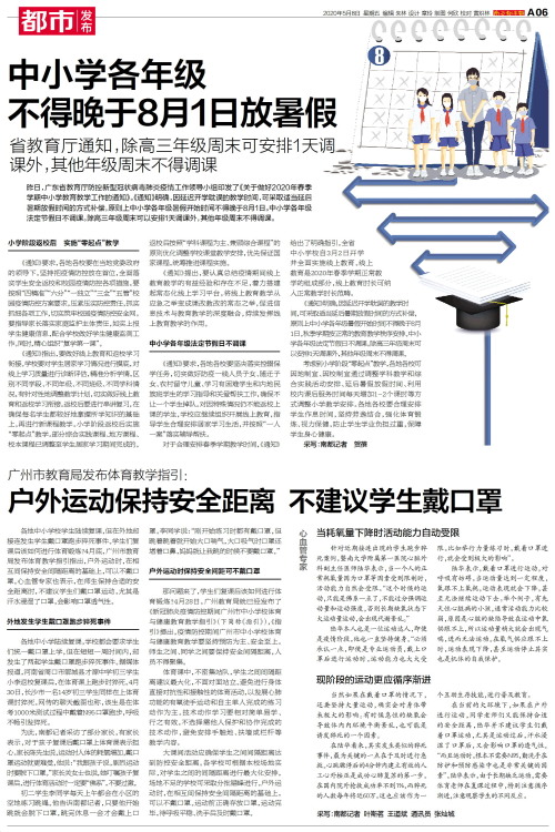昨日,广东省教育厅防控新型冠状病毒肺炎疫情工作领导小组印发了《关于做好2020年春季学期中小学教育教学工作的通知》。《通知》明确,因延迟开学耽误的教学时间,可采取适当延后暑期放假时间的方式补偿,原则上