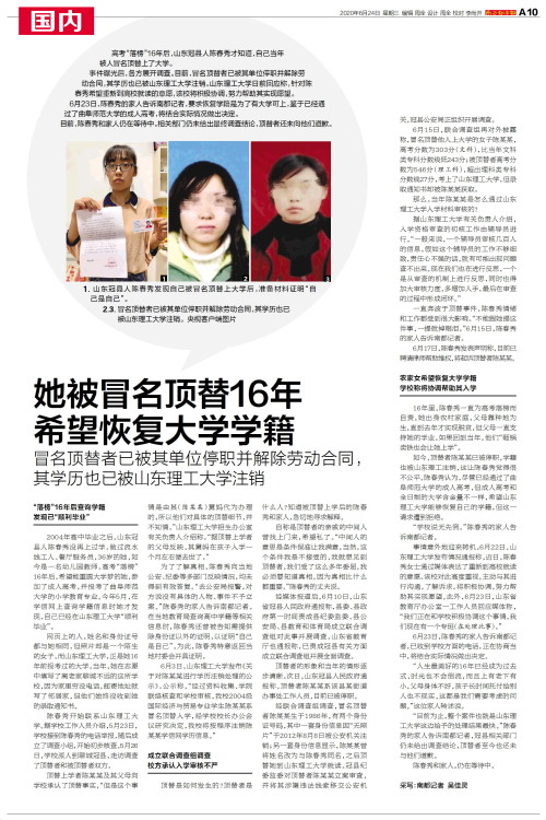 高考“落榜”16年后,山东冠县人陈春秀才知道,自己当年被人冒名顶替上了大学。事件曝光后,各方展开调查。目前,冒名顶替者已被其单位停职并解除劳动合同,其学历也已被山东理工大学注销。山东理工大学日前回应称