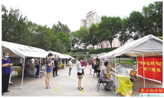 6月24日,北京市西城区手帕口南街核酸检测集中采样点,市民有序接受核酸检测采样。北京日核酸检测能力已提升至30万份以上。新华社发