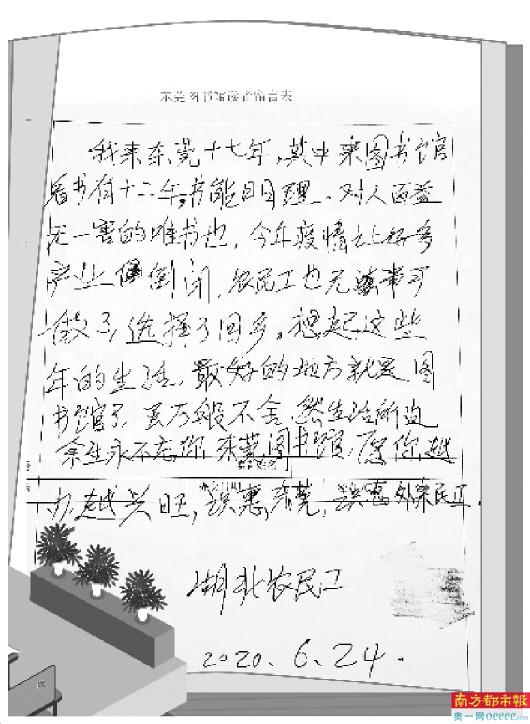 由于疫情影响,吴桂春原本工作的鞋厂停工,无奈之下打算返乡。离开之前,来到东莞图书馆退读者卡。他说退卡时心里特别难受,把卡拿在手里放下又拿起,拿起又放下,原本不想销掉这张陪伴了自己十几年的卡,又想着万一不回东莞,拿在手里也没用,最终忍不住在留言簿上写下了对东莞图书馆的眷恋与不舍。