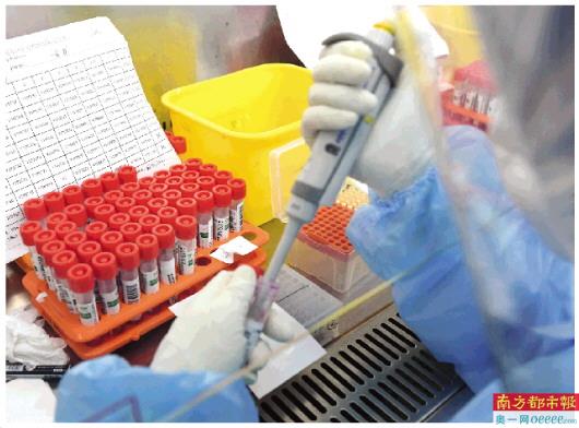 26日凌晨,北京金域医学检验实验室检验人员在处理核酸检测样本。 新华社发