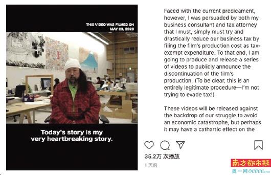 南都讯 记者黄茜 7月1日,日本著名艺术家村上隆在Instagram上发布了一段14分43秒的短视频,向其200多万名粉丝宣布,因为新冠疫情影响,自己的画廊兼公司Kaikai Kiki正面临破产。村上隆坐在工作室的镜头前说:“今天的故事是一个让人心碎的故事。”残酷的现实迫使他不得不中止手中正在进行的一系列项目,其中包括备受期待的科幻电影《水母看世界2:Mahashankh》(Jellyfish Eyes2:Mahashankh)。