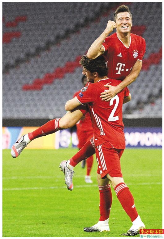 拜仁球员莱万多夫斯基(上)入球后与队友庆祝,目前在欧冠打进13球的他高居射手榜首位。 新华社发