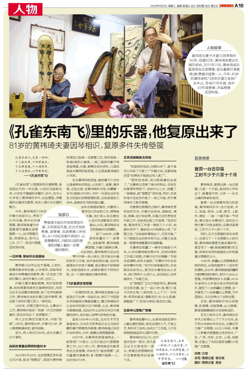 人物故事黄祎琦与妻子许碧兰因琴相识60年,结婚52年。黄祎琦钟爱古代器乐研究,2011年11月,黄袆琦成功复原两台古竖箜篌,成为重塑可演奏用(唐)箜篌中国第一人。今年,81岁的黄祎琦和73岁的许碧兰来