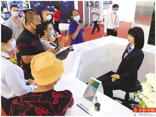 昨日,服贸会金融服务专题展区,观众在一家参展机构的展位上与银行仿真机器人大堂经理(右)交流互动。 新华社发