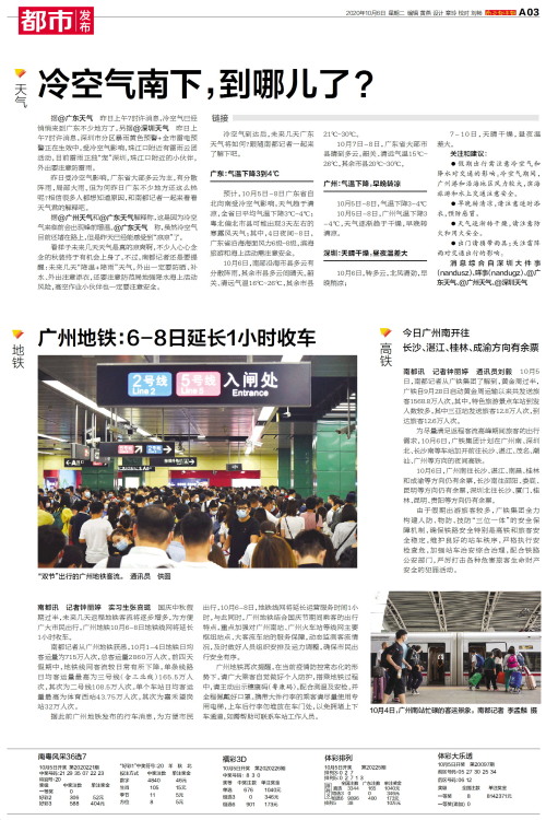 地铁南都讯 记者钟丽婷 实习生张熹珑 国庆中秋假期过半,未来几天返程地铁客流将逐步增多,为方便广大市民出行,广州地铁10月6-8日地铁线网将延长1小时收车。南都记者从广州地铁获悉,10月1-4日地