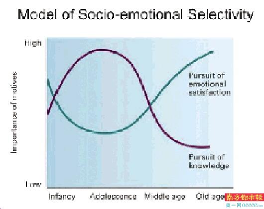 “社会情绪选择理论”示意图,绿线代表随年龄增长的情感追求变化。