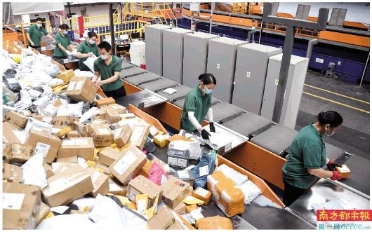 昨日,在中国邮政集团广州航空邮件处理中心,工作人员在分拣机的帮助下进行供包作业。“双十一”来临之际,该邮件处理中心一片繁忙景象。工作人员借助分拣设备加紧作业,保障“双十一”高峰期间物流正常运转。 新华社发