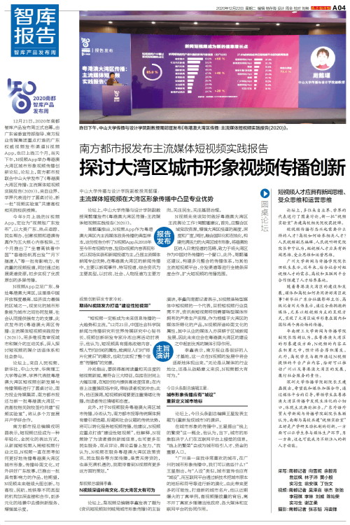 12月21日,2020年南都智库产品发布周正式启幕。由广东省委宣传部指导、南方报业传媒集团重点打造的广东权威视频发布渠道N视频App,也已上线三个月。当天下午,N视频App举办粤港澳大湾区城市形象视频传播创新论坛。论坛上,南方都市报联合中山大学发布了《粤港澳大湾区传播:主流媒体短视频实践报告(2020)》。来自业界、学界代表进行了圆桌讨论,新一批“视频实验室”共建高校相关院校获授牌。