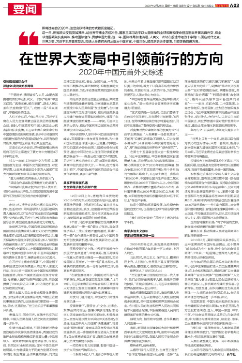 即将过去的2020年,注定会以特殊的方式被历史铭记。这一年,新冠肺炎疫情突如其来,给世界带来全方位冲击。国家主席习近平以大国领袖的全球视野和使命担当密集开展元首外交,在全球范围凝聚抗疫共识,推动国际合