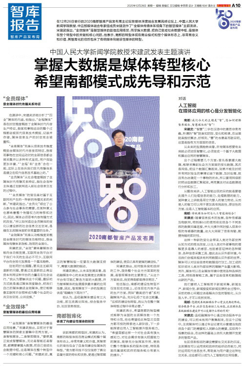 在12月26日举行的2020南都智库产品发布周主论坛暨媒体深度融合发展高峰论坛上,中国人民大学新闻学院教授宋建武作了“全媒体传播体系视角下的智慧媒体”主题演讲。 宋建武指出,“