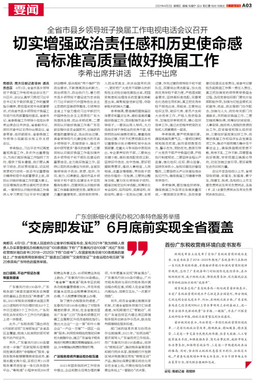南都讯 4月1日,广东省人民政府办公室举行新闻发布会,发布2021年“我为纳税人缴费人办实事暨便民办税春风行动”100条措施(下称“广东春风行动100条”)和《广东税收营商环境白皮书(2018—2020》(下称“白皮书”)。在国家税务总局100条措施的基础上,广东省税务局创新细化了“提速出口退税”“交房即发证”“全省远程办税互联”等20条具有广东特色的服务举措。