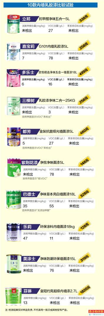 内墙乳胶漆是室内墙面、顶面的主要装饰材料之一,因其易于涂刷、干燥迅速、漆膜耐水、成本低、污染小等优点,现已成为众多家庭装修墙面的首选。为了帮助消费者更好地选择合适的油漆,近日,此次南都鉴定评测实验室选取了市场上10款主流品牌内墙面漆,并委托专业检测机构进行了检测。此次送检包括立邦、嘉宝莉、多乐士、三棵树、芬琳等品牌。