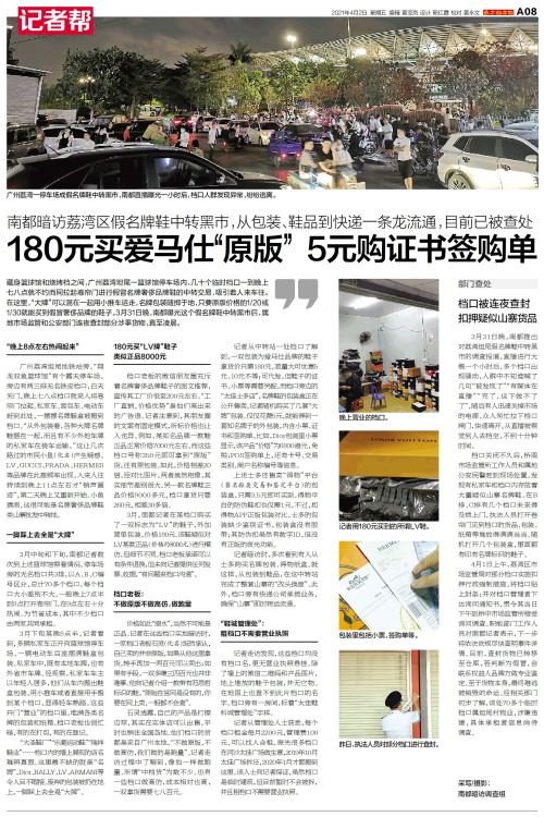 藏身篮球馆和烧烤档之间,广州荔湾坦尾一篮球馆停车场内,几十个临时档口一到晚上七八点就不约而同拉起卷帘门进行假冒名牌奢侈品牌鞋的中转交易,吸引着人来车往。在这里,“大牌”可以混在一起用小推车运走,名牌包