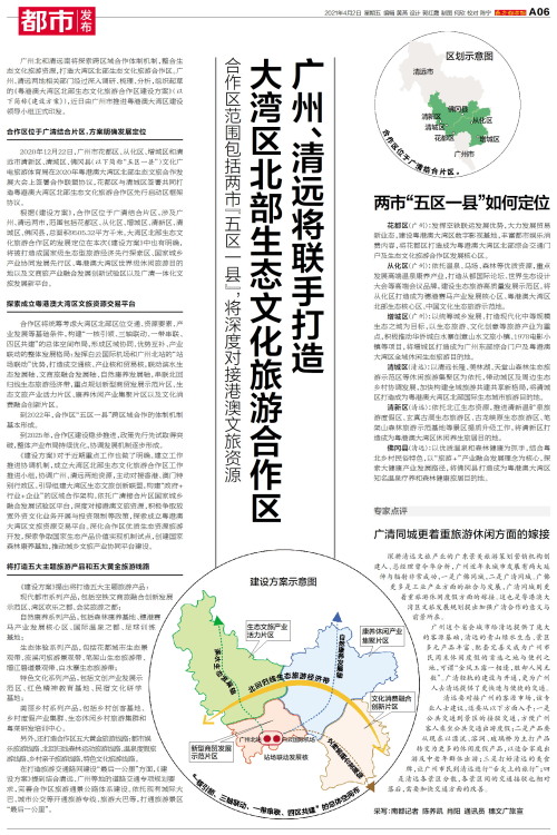 广州北和清远南将探索跨区域合作体制机制,整合生态文化旅游资源,打造大湾区北部生态文化旅游合作区。广州、清远两地相关部门经过深入调研、梳理、分析,组织起草的《粤港澳大湾区北部生态文化旅游合作区建设方案》