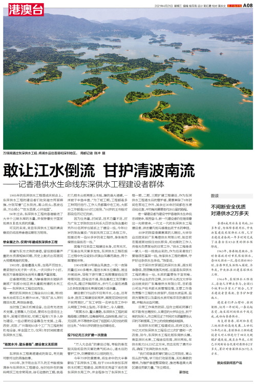 1965年的东深供水工程落成庆祝会上,东深供水工程的建设者们收到港方两面锦旗,分别写着“江水倒流,高山低头;恩波远泽,万众倾心”“饮水思源,心怀祖国”。 56年过去,东深供水工程向香港输送了大半