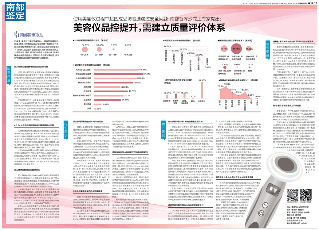 近年来,美容仪日渐成为爱美人士喜欢的家庭用品,但是,市场上的美容仪是否安全有效?4月16日下午,南方都市报大数据研究院、南都鉴定评测实验室主办了“美容仪品控提升与行业合规发展”南都智库沙龙,与风险监测