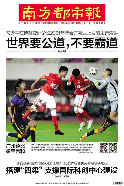 昨晚,2021赛季中超联赛在广州天河体育中心拉开大幕,约3万球迷到场观看。当晚8时,本届中超的揭幕战“广州德比”激情上演,广州队对阵广州城队以2:2打平。这是广州队球员阿兰头球攻门。这场中超揭幕战