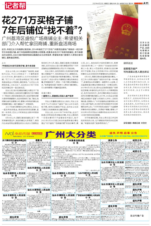近日,市民汪女士向南都记者反映,2014年她花了271万在广州荔湾区盛悦广场购买一间20多平方米的格子铺,前三年免租委托给管理公司管理。结果本应在2017年收回的铺位,至今她都没办法收回。汪女