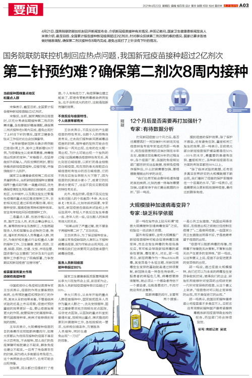 4月21日,国务院联防联控机制召开新闻发布会,介绍新冠疫苗接种有关情况,并答记者问。国家卫生健康委新闻发言人米锋介绍,截至目前,全国累计报告接种新冠疫苗超过2亿剂次。针对群众反映第二剂次预约难的情况,