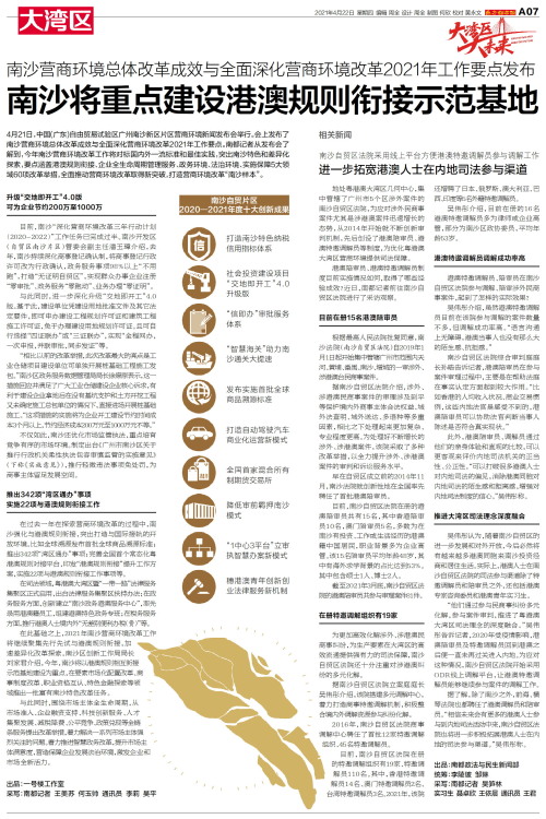 4月21日,中国(广东)自由贸易试验区广州南沙新区片区营商环境新闻发布会举行。会上发布了南沙营商环境总体改革成效与全面深化营商环境改革2021年工作要点。南都记者从发布会了解到,今年南沙营商环境改革工