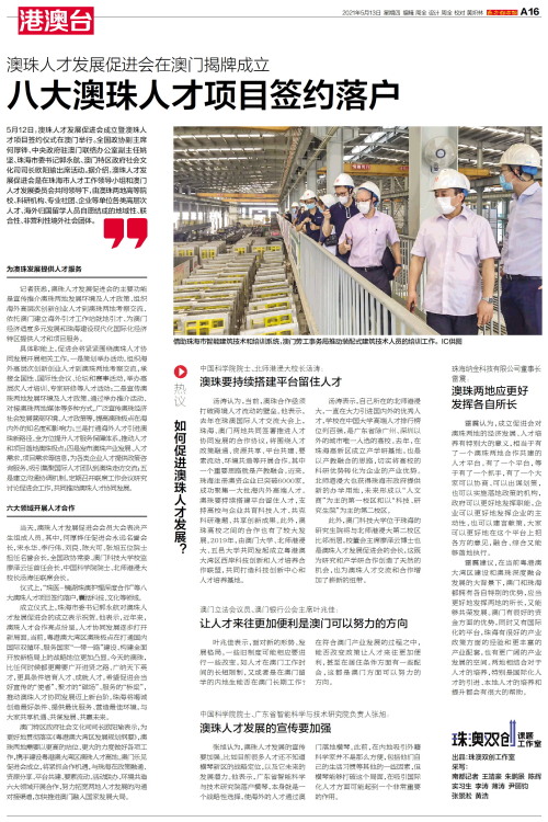5月12日,澳珠人才发展促进会成立暨澳珠人才项目签约仪式在澳门举行。全国政协副主席何厚铧、中央政府驻澳门联络办公室副主任姚坚、珠海市委书记郭永航、澳门特区政府社会文化司司长欧阳瑜出席活动。据介绍,澳珠