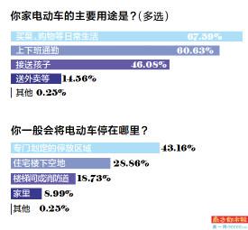 问及电动车的使用频率和使用方式时,58.77%的受访者表示几乎每天都会骑行,33.38%表示每周有几天会骑行;六成以上受访者表示自己骑行电动车主要用于买菜、购物或上班通勤。可以看出,目前电动自行车已经成为不少家庭的主要交通工具之一。