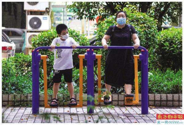 海珠区瑞宝街南洲名苑小区解封后,居民在使用健身器材。 南都记者 吴泽嘉 摄