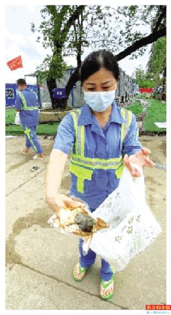 中午时分,在临时宿舍B区,刚来增援的环卫工人、46岁的湛江人庆梅展示了她的午餐:一份盒饭、一罐王老吉凉茶、两个粽子。庆梅说,因为当天刚好是她的生日,她多分到了一个粽子,“吃粽子庆祝生日!”