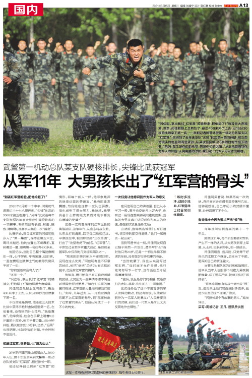 “闫佳明,拿出我们‘红军营’的精神来,把他超了!”教导员大声喊道。忽然,闫佳明腿上又有劲了,最后400米冲了上去,以10分30秒的成绩拿下第一名……南都记者探营武警第一机动总队某支队“红军营”,采