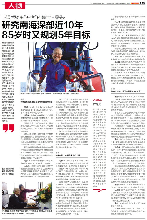 人物名片 汪品先 1936年11月出生,著名海洋地质学家,国家重点基础研究发展规划项目“地球圈层相互作用中的深海过程和深海记录”首席科学家、国家重点学科“海洋地质学”学科带头人。以82岁高龄毅