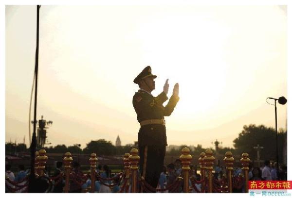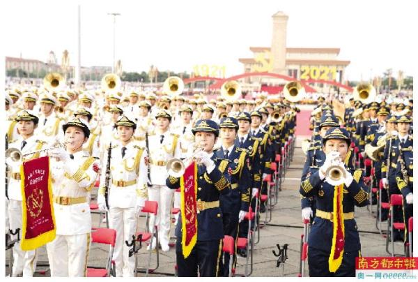 7月1日早上7时36分许,随着总指挥双臂一挥,约1200名身着三军礼服、手戴白手套的演奏员,同时奏响悠扬婉转的《唱支山歌给党听》,美妙的童声随即响起。中国人民解放军联合军乐团的英姿又一次出现在北京天安门广场、国旗杆的北侧。