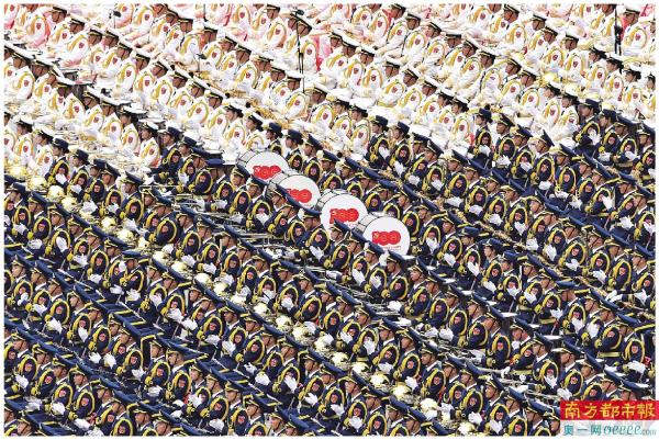 1200名身着三军礼服的中国人民解放军联合军乐团乐手。 新华社发