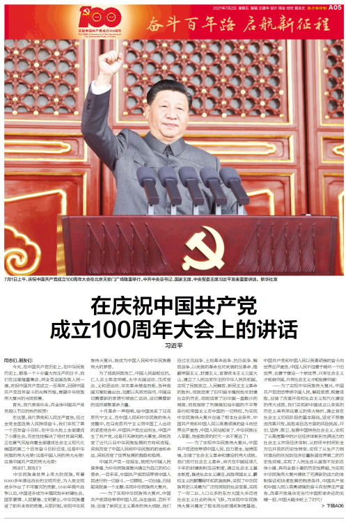 同志们,朋友们: 今天,在中国共产党历史上,在中华民族历史上,都是一个十分重大而庄严的日子。我们在这里隆重集会,同全党全国各族人民一道,庆祝中国共产党成立一百周年,回顾中国共产党百年奋斗的光辉历程,