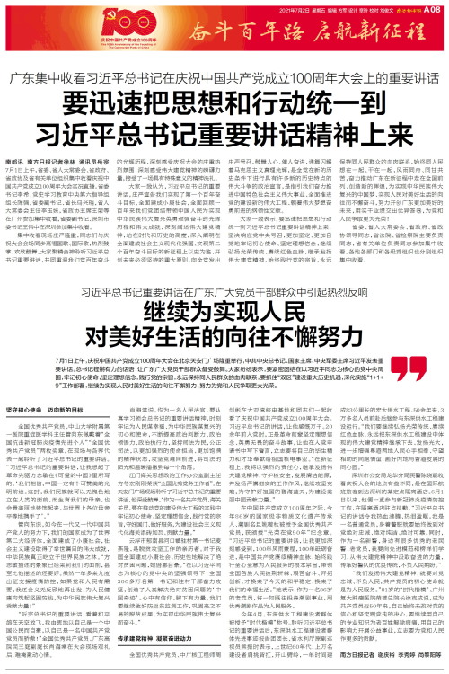 7月1日上午,庆祝中国共产党成立100周年大会在北京天安门广场隆重举行,中共中央总书记、国家主席、中央军委主席习近平发表重要讲话。总书记铿锵有力的话语,让广东广大党员干部群众备受鼓舞。大家纷纷表示