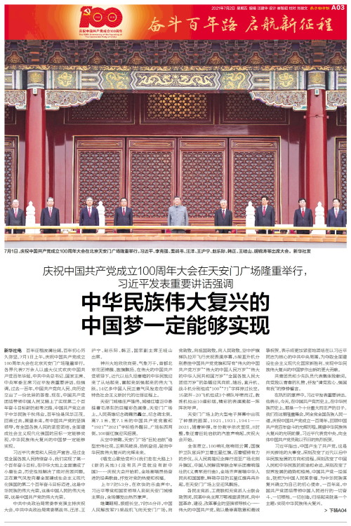 7月1日,庆祝中国共产党成立100周年大会在北京天安门广场隆重举行。习近平、李克强、栗战书、汪洋、王沪宁、赵乐际、韩正、王岐山、胡锦涛等出席大会。 新华社发 新华社电