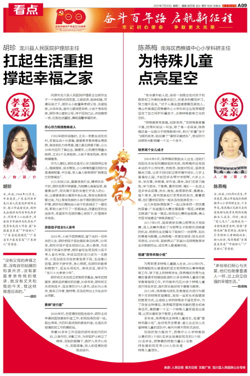孝老 爱亲 人 物 简 介 胡珍 女,汉族,1968年12月生,中共党员,广东省河源市龙川县人民医院护理部主任。因工作成绩突出,胡珍先后被评为河源市优秀护士、河源市三八红旗手,并连续多年被评