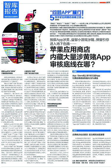 调查发现,苹果App Store随意就能搜到涉黄涉赌App;华为应用商店里“12+、16+应用”频现搭讪骚扰、氪金诱导;小米应用商店不仅推广内含大量“无版号”游戏App,而且存在过度索权、弹窗骚扰等问题;vivo为国内用户提供海外应用商店下载渠道,内含大量偷拍软件……违规收集信息、弹窗广告乱象,App里诈骗、黑产、有偿色情服务等内容违规行为不容小觑。从应用审核、到上架监管,平台存在哪些管理之缺,未尽之责?如何做好全方位的内容合规审查?围绕违规应用监管、未成年人保护、广告服务、收集隐私合规等领域,多位互联网专家结合自身研究对此发表真知灼见,来看看他们有哪些针对性的好建议。