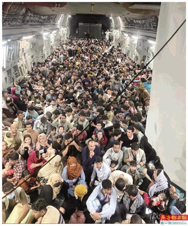 8月15日,大量民众坐在一架从阿富汗喀布尔飞往卡塔尔的美军运输机中。 新华社发