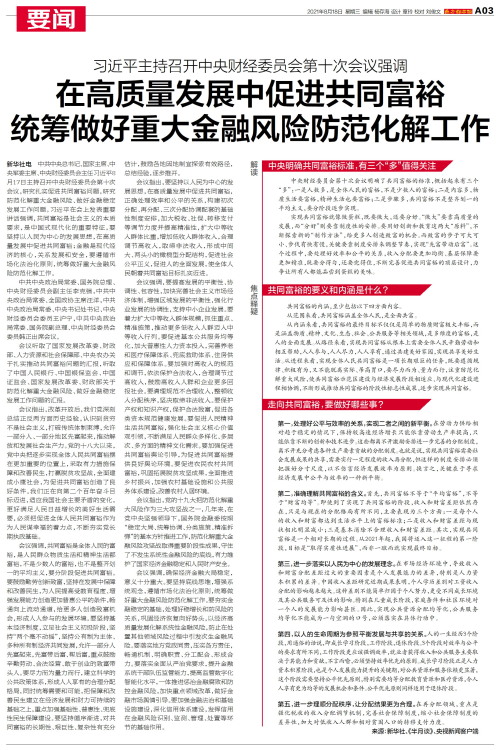 新华社电 中共中央总书记、国家主席、中央军委主席、中央财经委员会主任习近平8月17日主持召开中央财经委员会第十次会议,研究扎实促进共同富裕问题,研究防范化解重大金融风险、做好金融稳定发展工作问题。