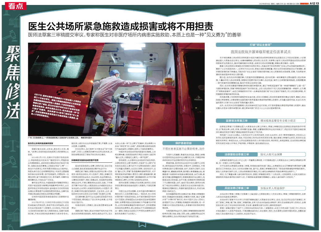 8月17日,医师法草案三审稿提交十三届全国人大常委会第三十次会议审议。草案三审稿明确医师在公共场所因自愿实施急救造成受助人损害的,不承担民事责任。南都记者了解到,医生对非医疗场所内处于危急状态的病